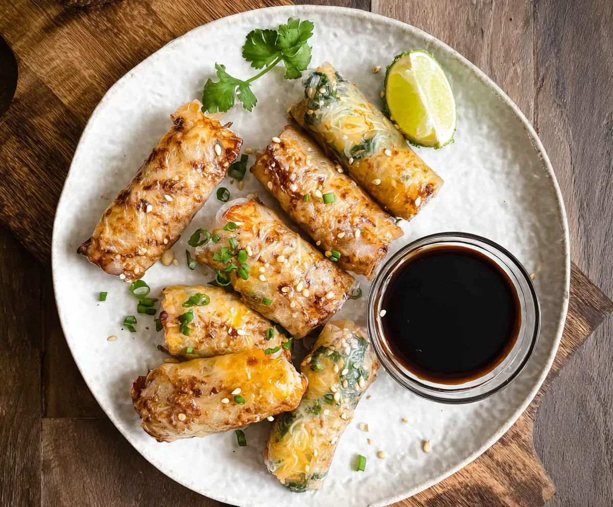 Enjoy your crispy, flavorful air fryer rice paper rolls with a melty cheesy topping!