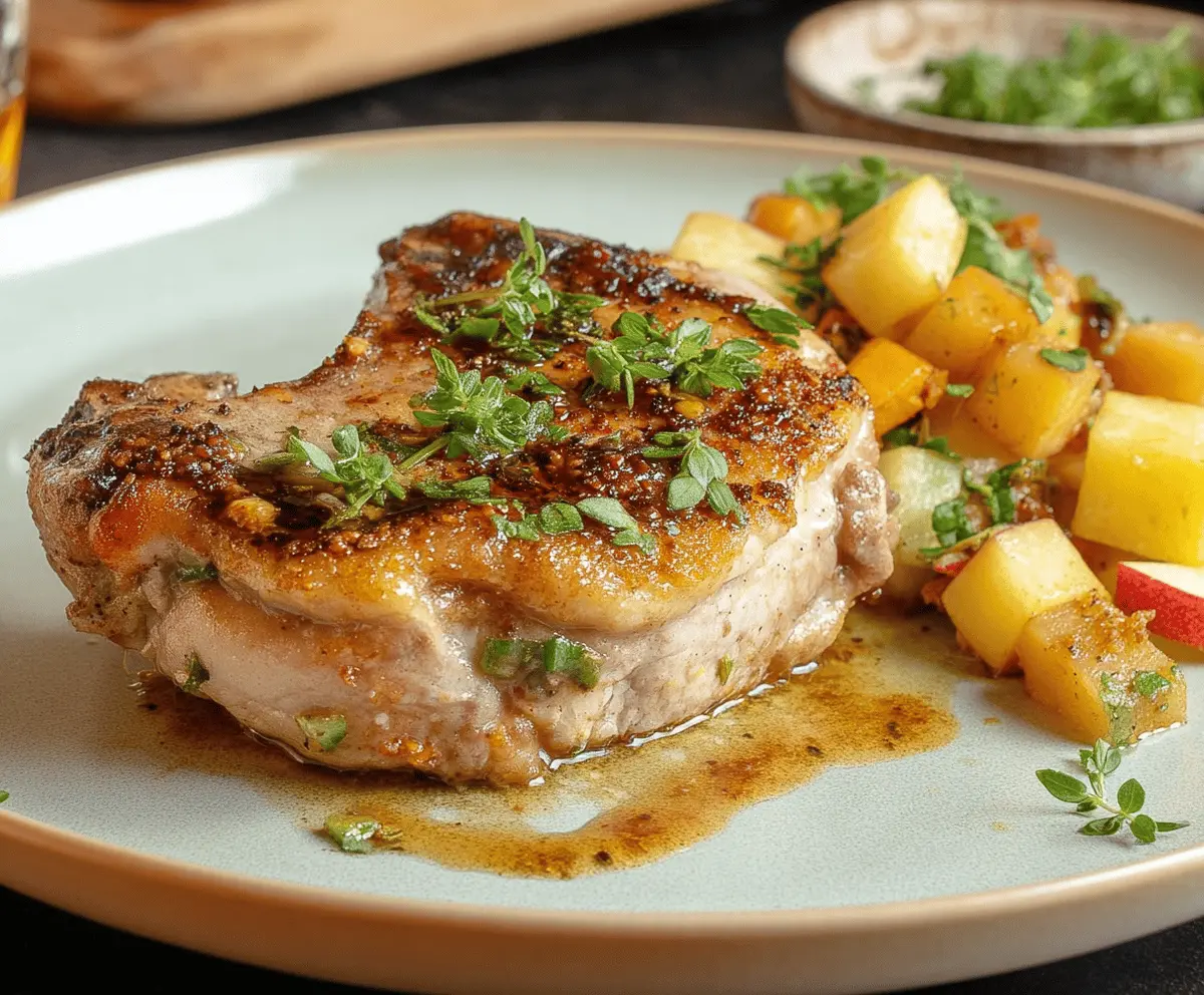 Once done, take the skillet out of the oven and let the pork chops rest for about 5 minutes. This step allows the juices to redistribute, making the meat even juicier. Finally, garnish with fresh thyme or parsley and serve the pork chops with the apple chunks from the pan scooped right on top.