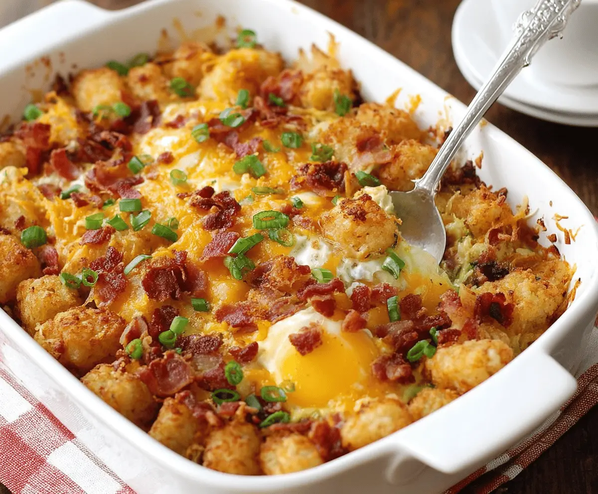 This Bacon Egg and Tater Tot Casserole is the perfect breakfast for any day! It’s packed with crispy bacon, fluffy eggs, and golden tater tots that make every bite a treat.