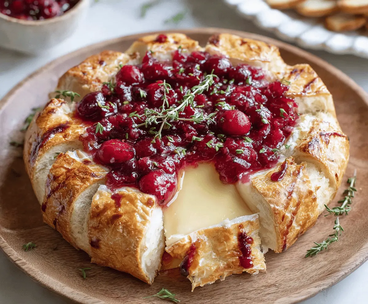 Serve your warm Baked Brie with crackers or sliced baguette. Enjoy the gooey, warm cheese with the tart-sweet cranberry topping and flaky pastry—this dish is sure to impress!