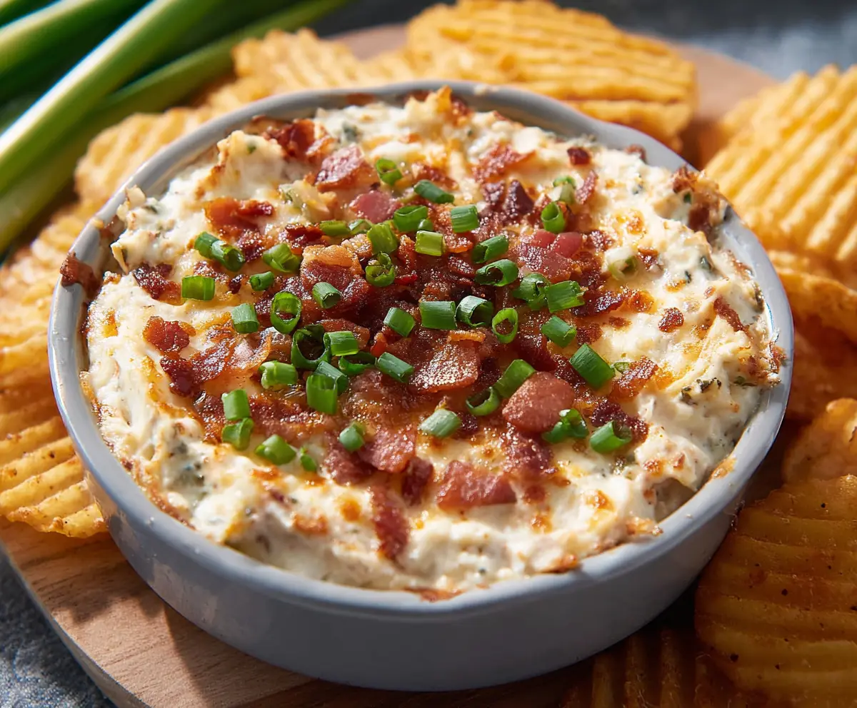 When you’re ready to serve, grab those waffle-cut potato chips and potato rounds for dipping. Enjoy your creamy baked potato dip that’s sure to be a hit at any gathering!