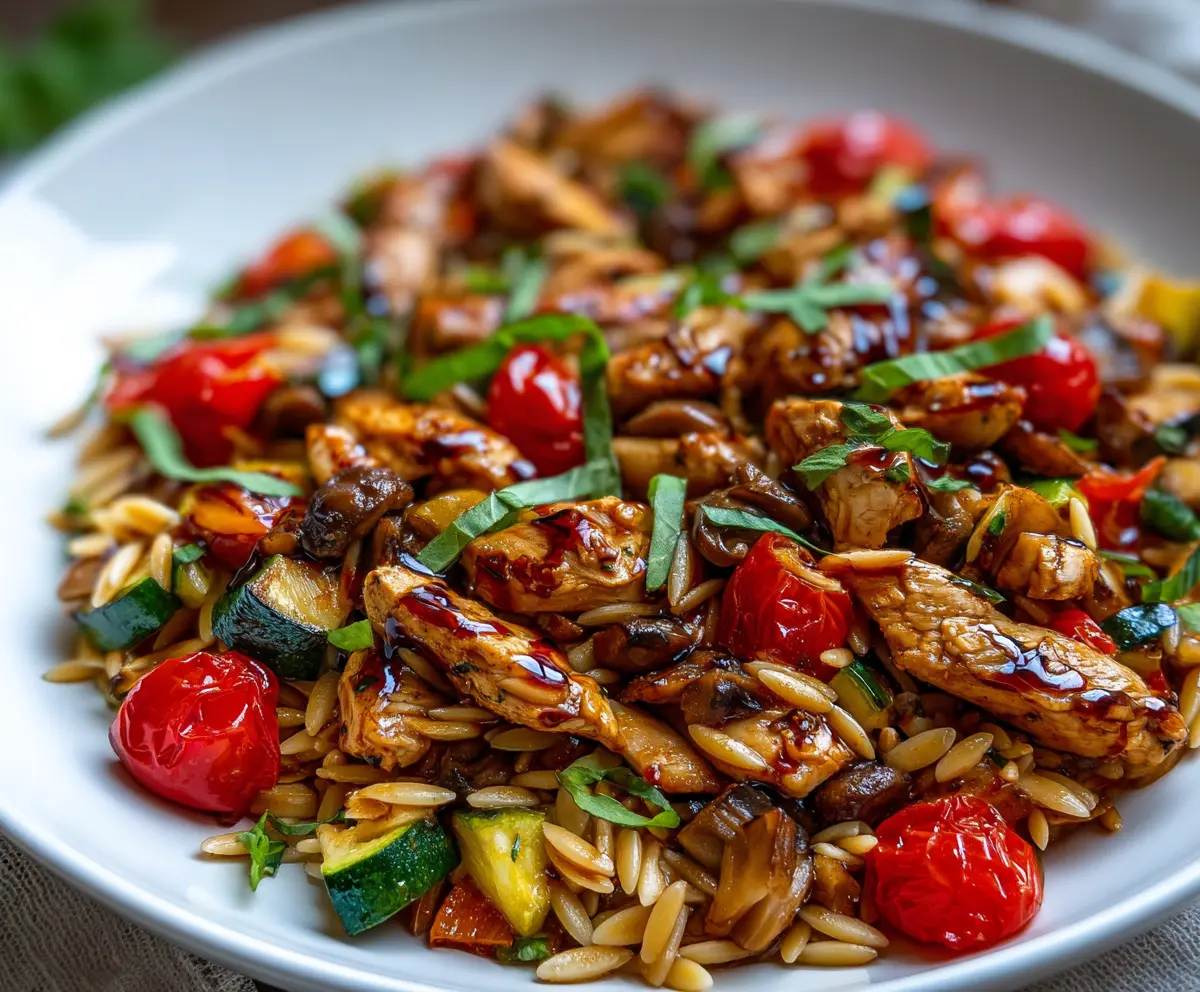Balsamic Chicken and Veggie Orzo is a tasty dish full of colorful veggies and tender chicken, all coated in a yummy balsamic glaze. It’s like a party on your plate!