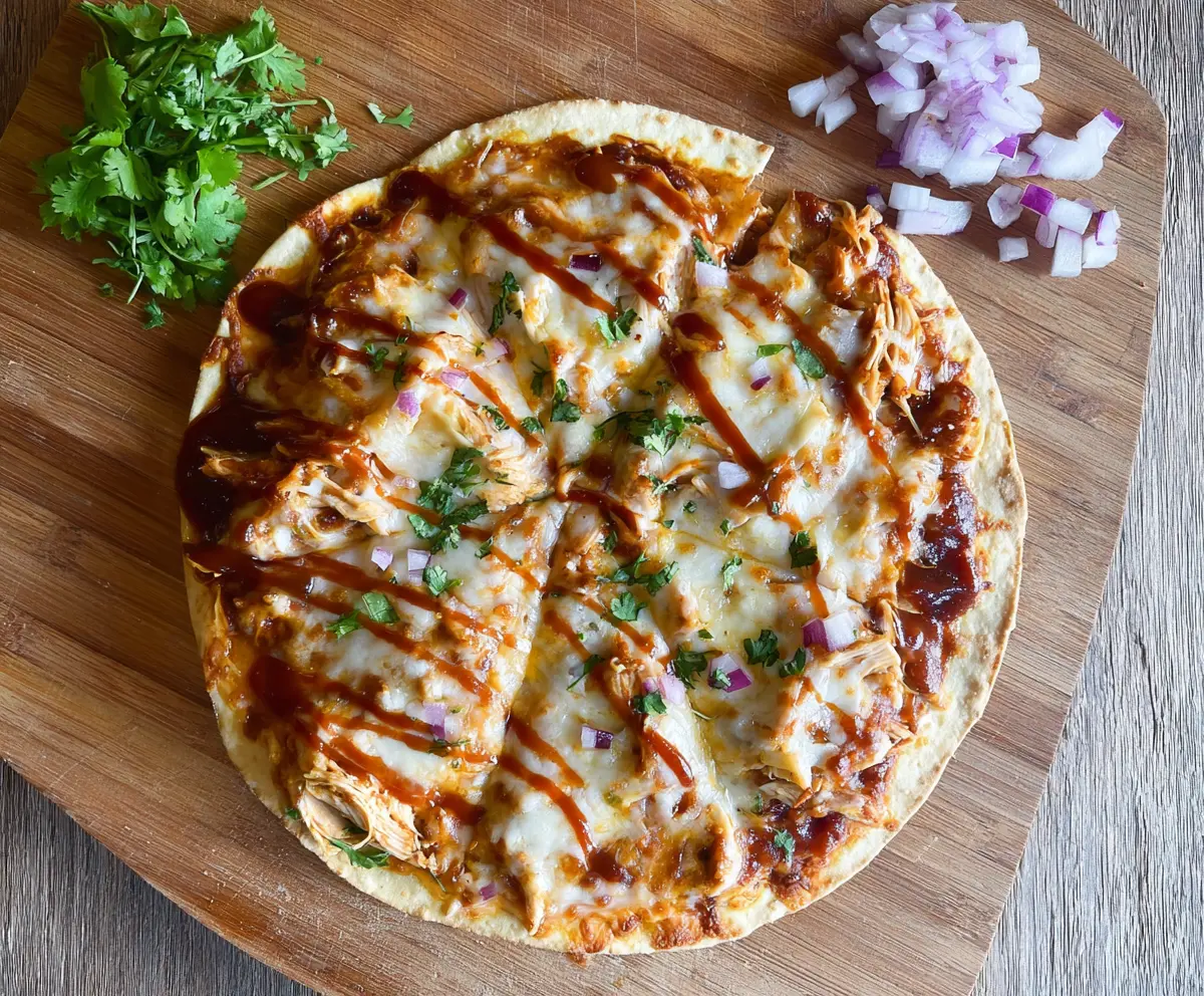 There you have it—your very own BBQ Chicken Tortilla Pizza, ready to be enjoyed! 🍕