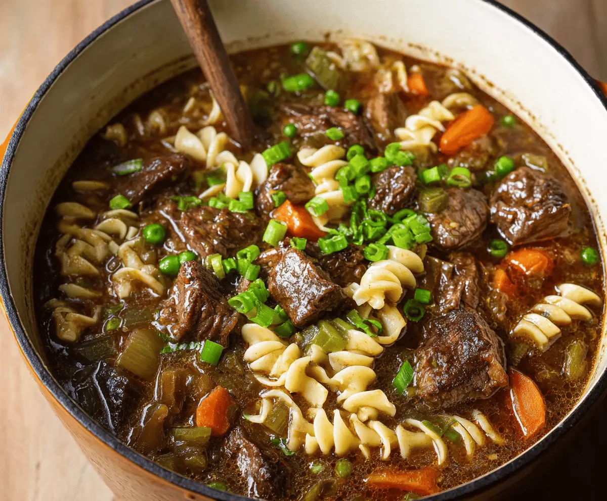 This hearty beef stew is a cozy dish filled with tender chunks of beef, tasty vegetables, and yummy noodles. It’s like a warm hug on a chilly day!