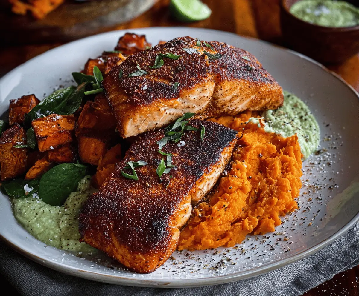 Once the sweet potatoes are roasted, you can either mash them roughly for a creamy texture or leave them as roasted cubes for some bite. On a plate, add a scoop of sweet potatoes and place the blackened salmon fillets alongside. Add a generous dollop of the creamy green sauce next to the salmon.