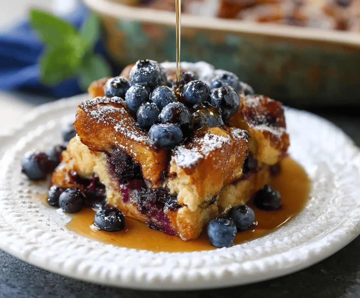 Cut into squares and serve warm, topped with extra blueberries, a dollop of whipped cream or vanilla yogurt, and a generous drizzle of maple syrup. Enjoy your delicious Blueberry French Toast Casserole!