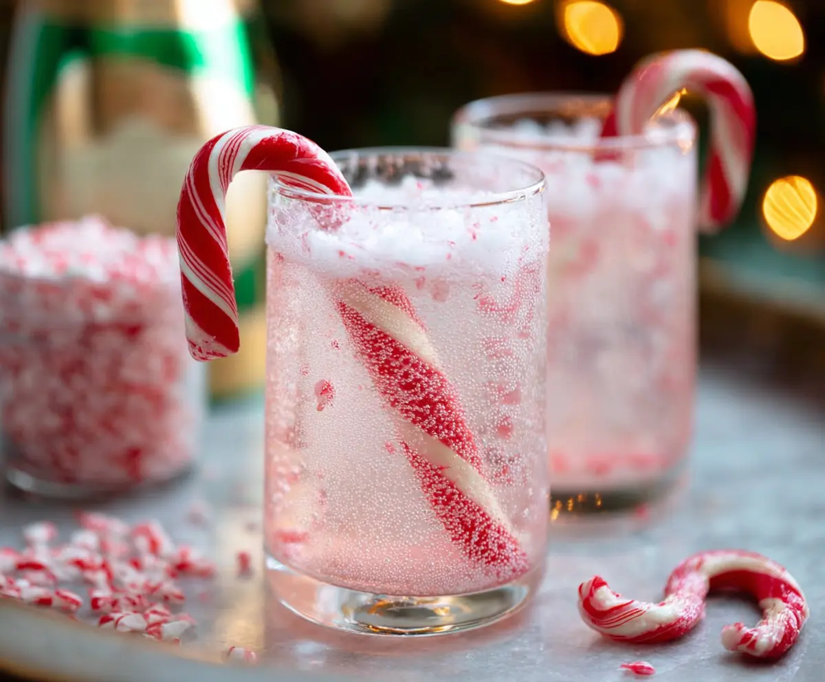 Using a spoon, gently stir the drink to mix the ingredients without losing the fizz. Finally, garnish each glass with a whole candy cane hooked on the rim for a lovely presentation.