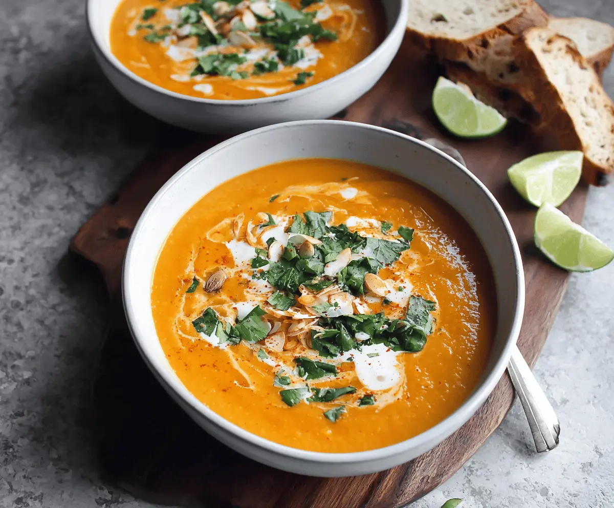 Top the soup with chopped fresh cilantro, toasted sliced almonds, and a sprinkle of red chili flakes or paprika for some heat. Serve with lime wedges on the side and some crusty toasted bread for dipping. Enjoy your vibrant, creamy, and comforting Coconut Curry Sweet Potato Soup!