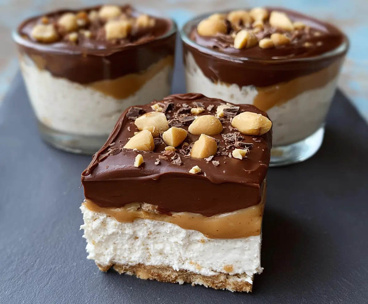 Now, refrigerate the whole dessert for at least 1 hour or until it is fully set. If you used a baking dish, cut it into bars for easy serving, or if you used glasses, serve directly. Enjoy your creamy, crunchy, peanut-buttery, chocolaty Cottage Cheese And Peanut Butter Snickers treats!