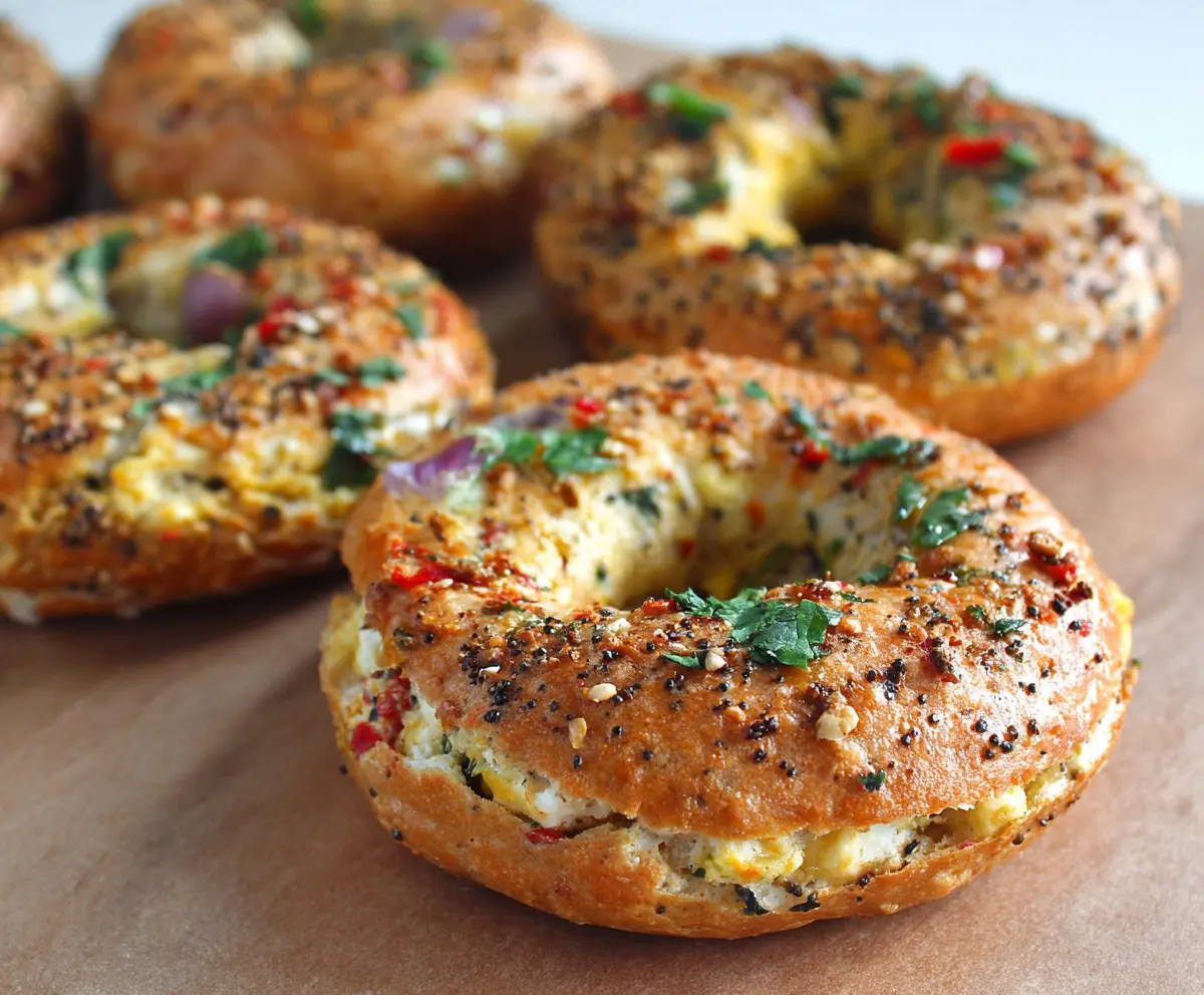 If your bagels aren’t toasted yet, slice them in half horizontally. Toast them lightly in a toaster or a skillet with a bit of olive oil or butter until they are golden brown and crispy. This adds a lovely crunch to your veggie bagels!