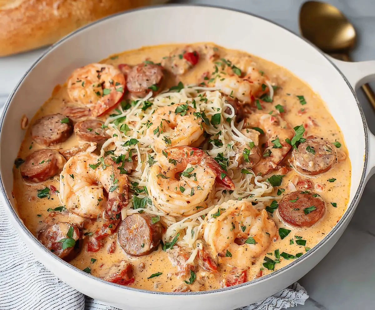 This creamy Cajun shrimp and sausage dish is a real treat! It’s filled with juicy shrimp, tasty sausage, and a rich, smooth sauce that brings all the flavors together.