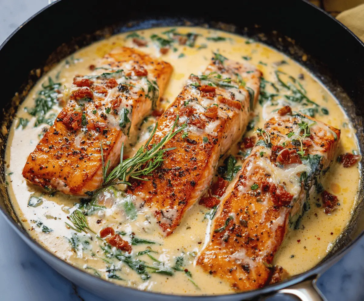 This Creamy Garlic Tuscan Salmon is a treat for your taste buds! It’s packed with tender salmon, tasty garlic, and sun-dried tomatoes in a rich, creamy sauce.