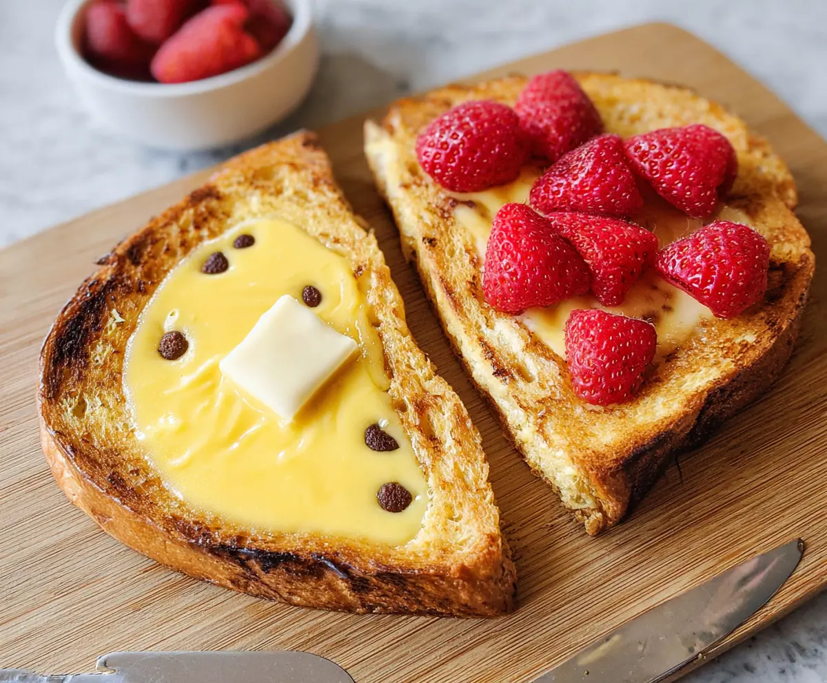 This recipe beautifully combines the creaminess of yogurt and custard on crunchy toasted brioche, enhanced by fresh berries, chocolate chips, and a touch of honey sweetness—perfect for starting your day with a smile!