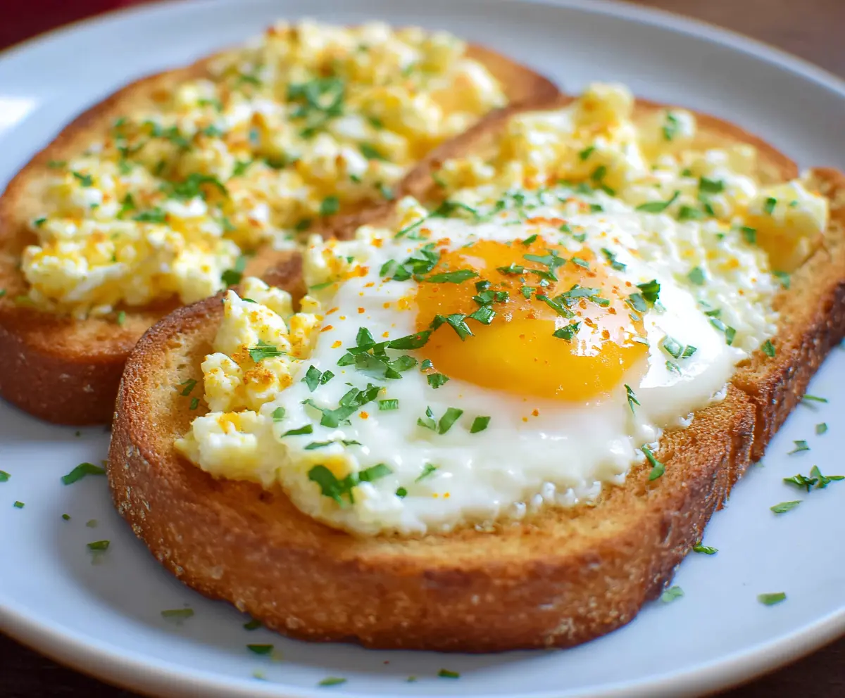 Place the freshly scrambled egg evenly on one slice of toasted bread. Then, gently place the fried egg on top of the scrambled eggs. This creates a delicious layered effect!