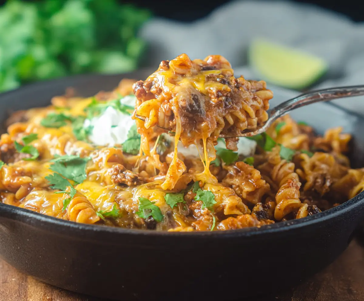 Once the cheese is melted, remove the skillet from heat. If you like, garnish your Enchilada Pasta with fresh chopped cilantro and sliced green onions for some added color and flavor.