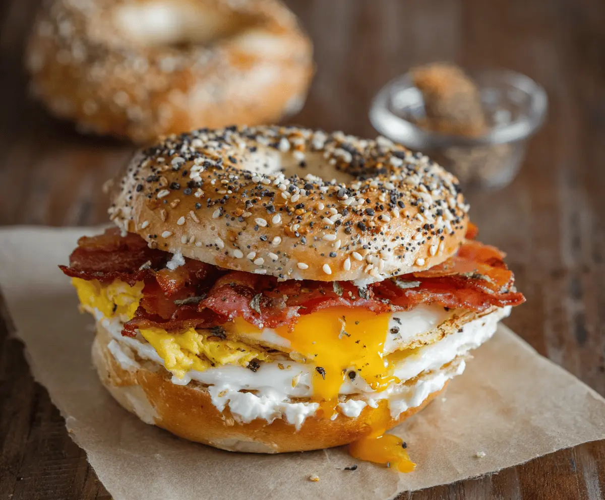This recipe will take about 15 minutes from start to finish. You’ll spend a few minutes cooking the bacon and eggs, and toasting the bagels. It’s quick, easy, and perfect for a hearty breakfast!