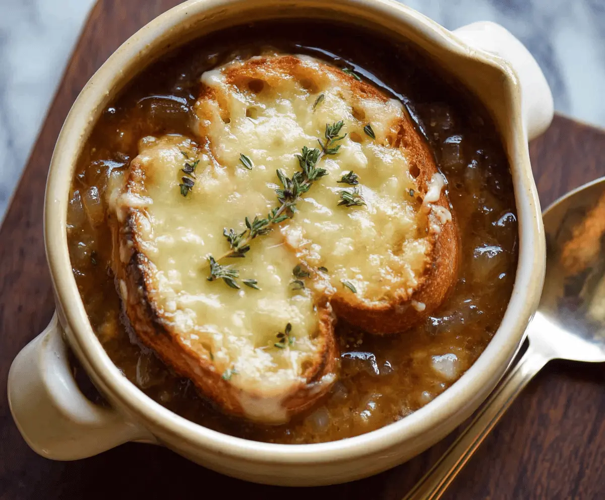 Carefully remove the bowls from the oven (they will be hot!). You can garnish with fresh thyme sprigs if you like. Serve the soup immediately and enjoy the comforting flavor of your homemade French Onion Soup!