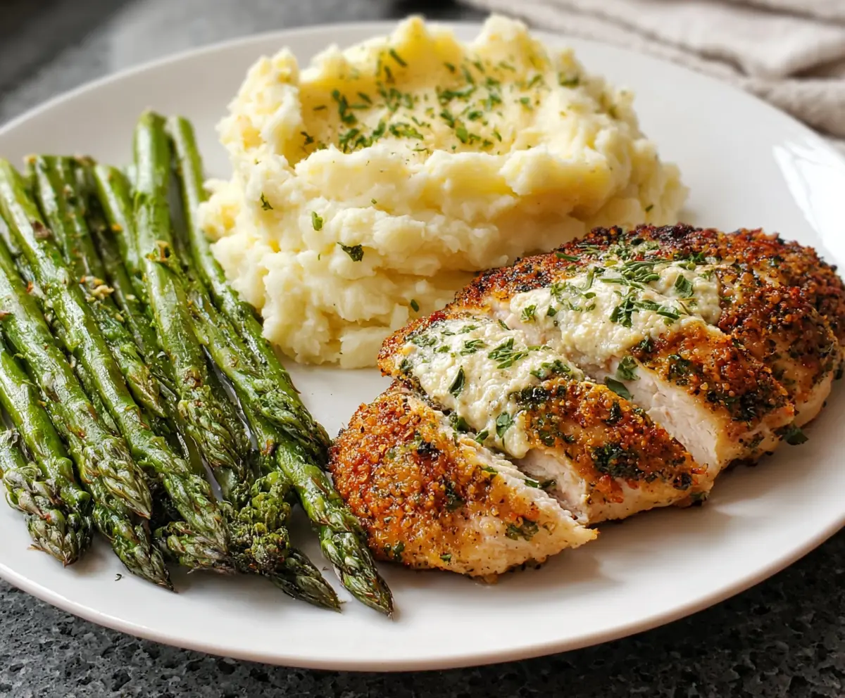 Enjoy your fantastic garlic herb chicken with smooth mashed potatoes and vibrant roasted asparagus. A delightful combination that’s sure to impress!