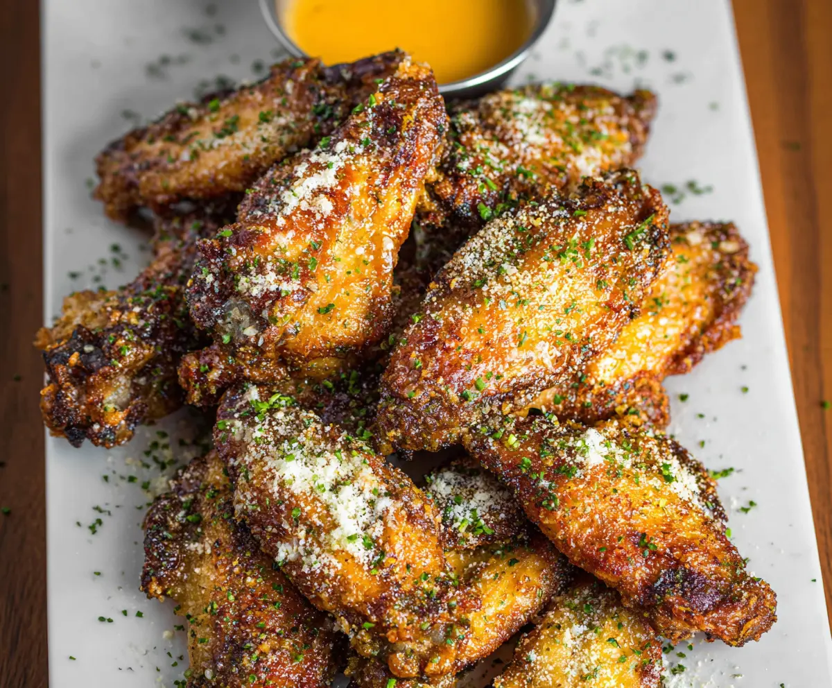 Garlic Parmesan Wings are crispy and packed with flavor! Coated in a buttery garlic sauce and sprinkled with cheesy goodness, they’re a real treat for your taste buds.