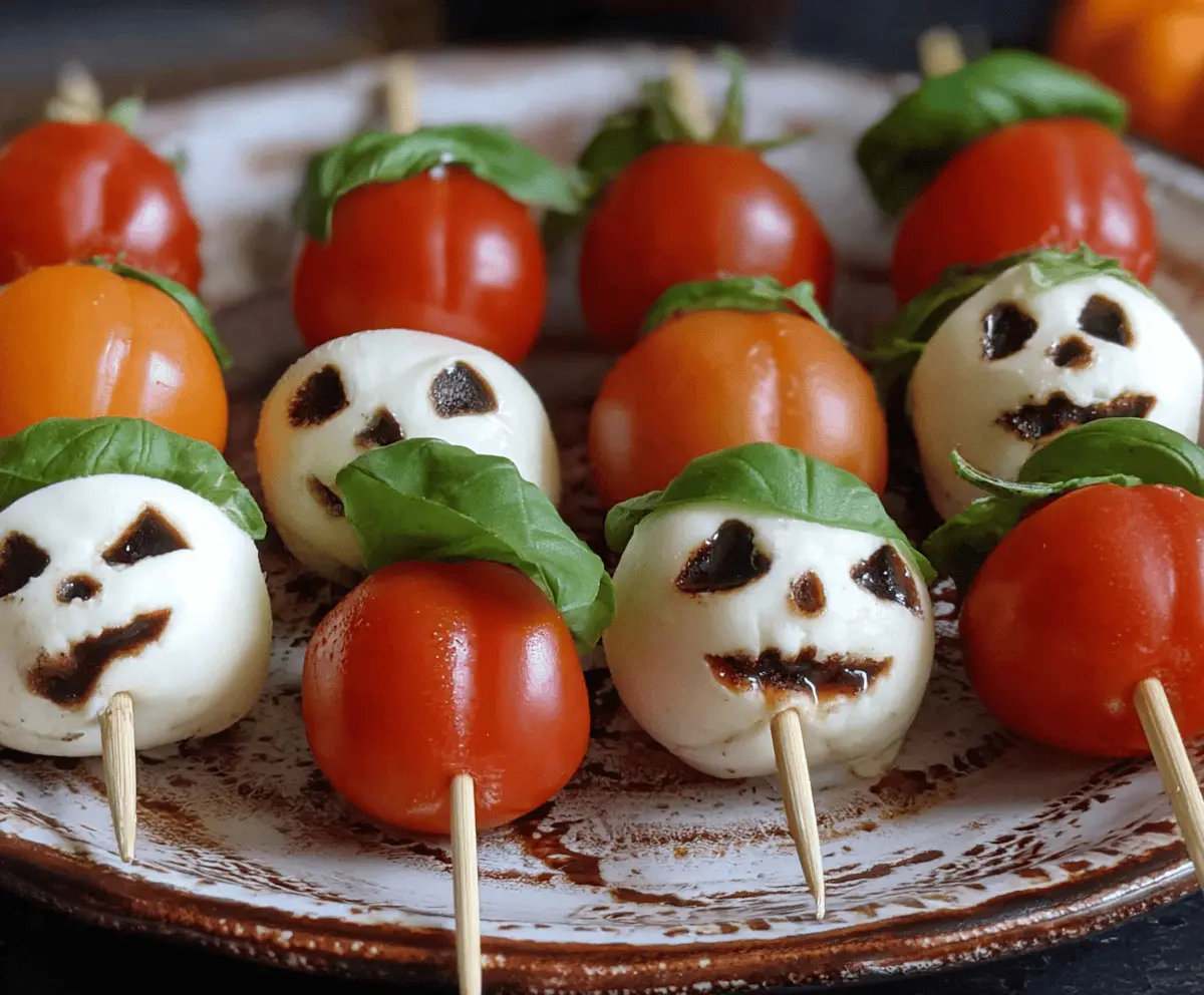 Get ready for some fun with Halloween Caprese Skewers! These tasty bites combine juicy cherry tomatoes, creamy mozzarella, and fresh basil—perfect for a spooky snack.