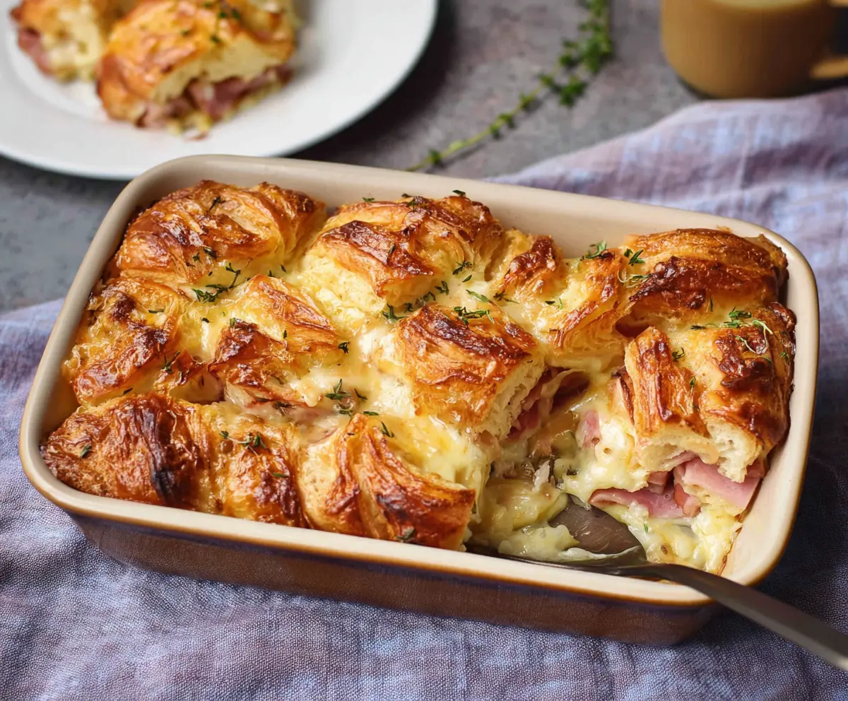 This Ham and Cheese Croissant Brunch Bake is a warm and tasty dish. Flaky croissants, gooey cheese, and savory ham come together for a delightful breakfast feast!