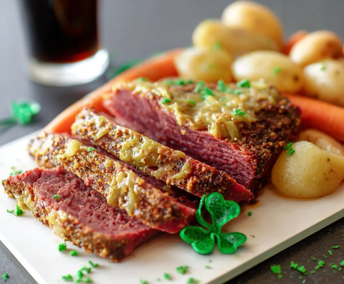Slice the corned beef against the grain and arrange it on a serving platter. Surround the meat with the cooked potatoes and carrots. Drizzle any remaining mustard glaze over the slices, and garnish with chopped parsley. Don’t forget to season the vegetables with a sprinkle of salt and pepper to taste!