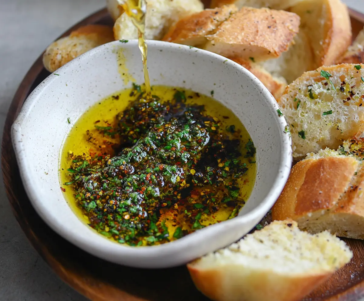 Place your olive oil dip next to the warm slices of bread. Encourage guests to dip their bread into the oil mixture. Enjoy the delicious flavors together—the vibrant herbs mixed with silky olive oil is a delightful experience!