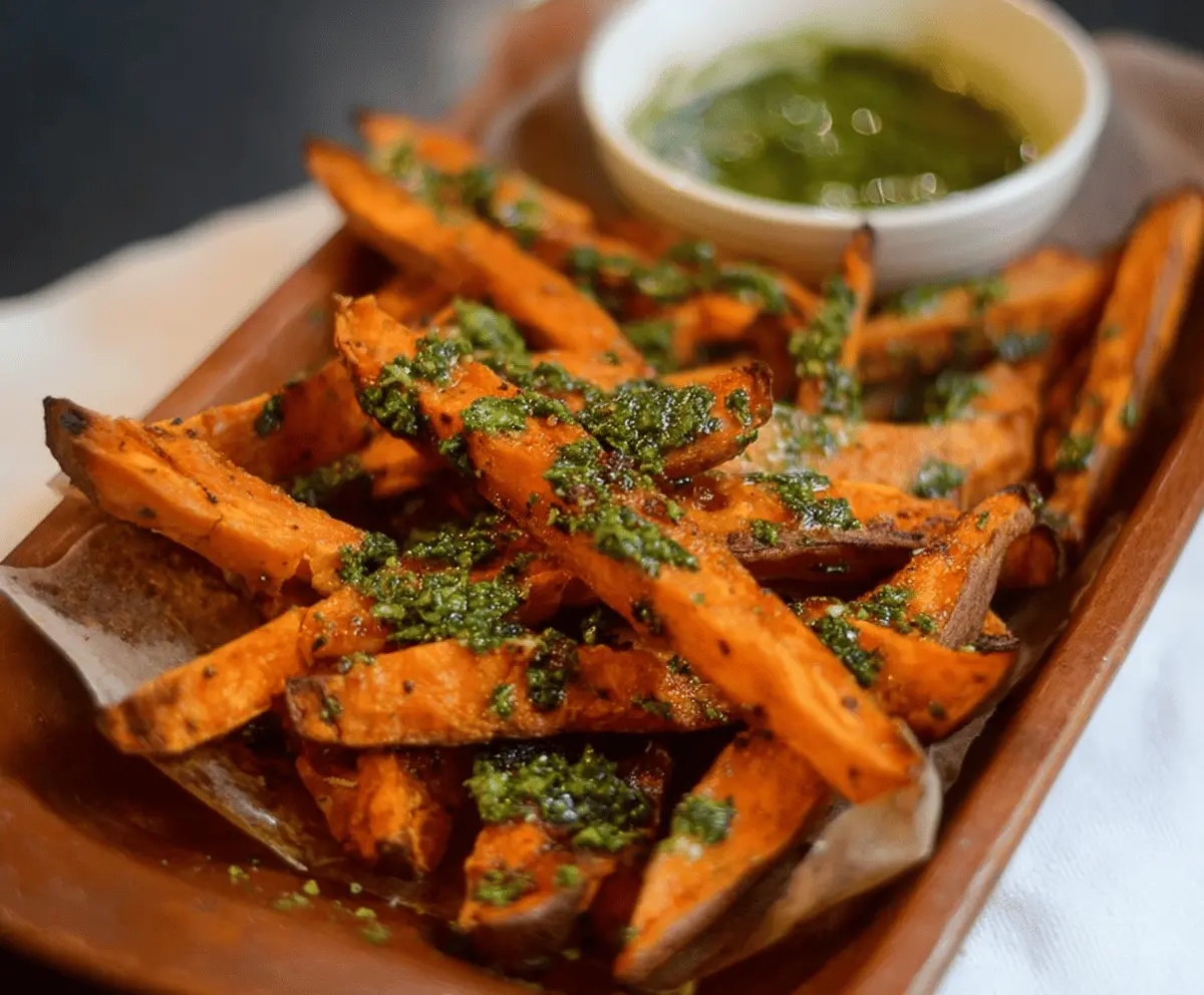 These Pesto Sweet Potato Fries are a fun twist on your regular fries. Crispy on the outside and soft inside, they’re tossed in bright and delicious pesto for an extra kick!