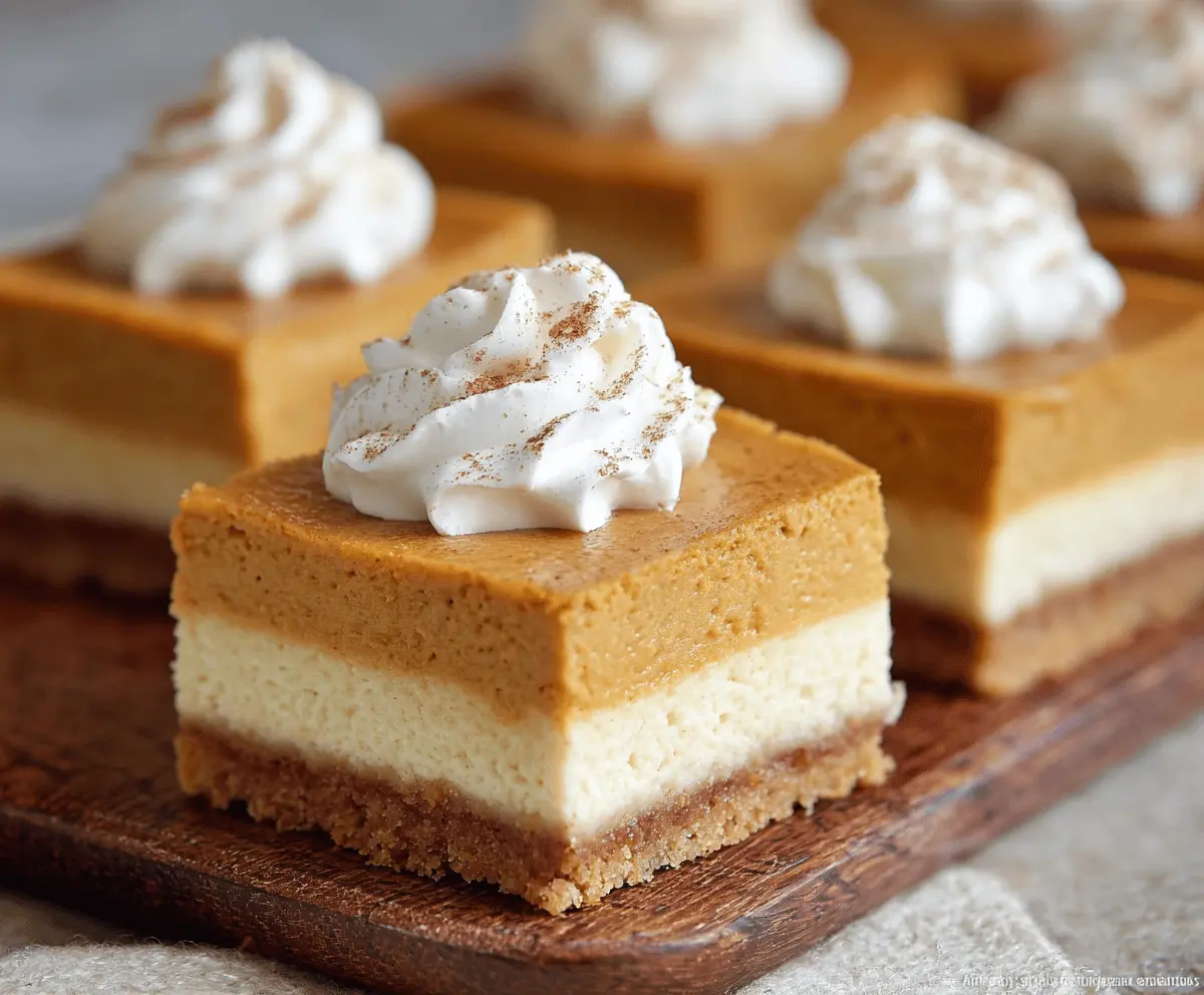 When you’re ready to enjoy, cut them into squares. Top each bar with a dollop of whipped cream and a sprinkle of cinnamon or pumpkin pie spice for that perfect finish!