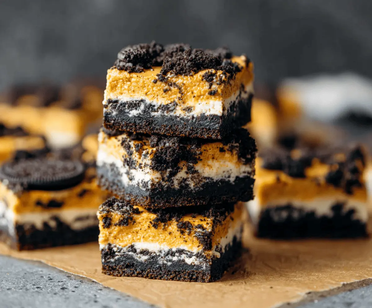 Enjoy the rich, creamy, and festive flavor combination of pumpkin and Oreos in these irresistible cheesecake bars!