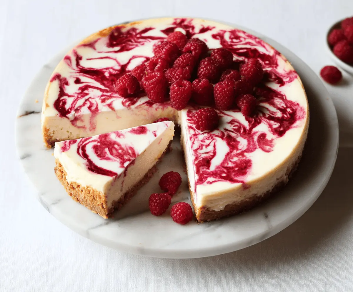 To create the beautiful raspberry swirl, use a knife or a skewer to gently swirl the raspberry sauce into the cheesecake batter. Start in the center and move outward to create a marbled effect. Avoid overmixing to keep those pretty swirls!