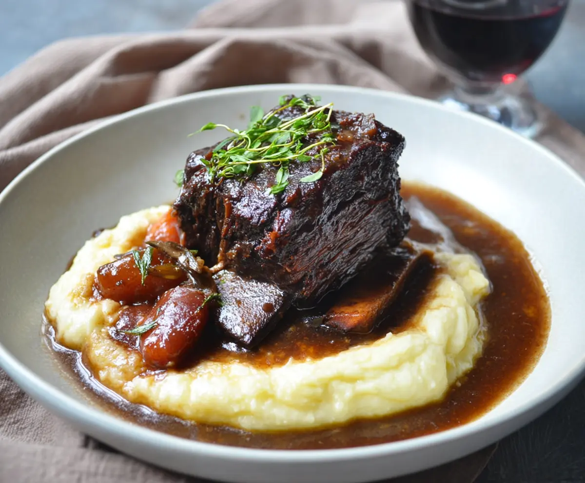 Plate the short ribs over a generous serving of creamy mashed potatoes, spoon the rich sauce and braised vegetables on top, and garnish with fresh thyme sprigs. Enjoy this hearty, flavorful dish with a glass of the same red wine used in cooking for the full experience!