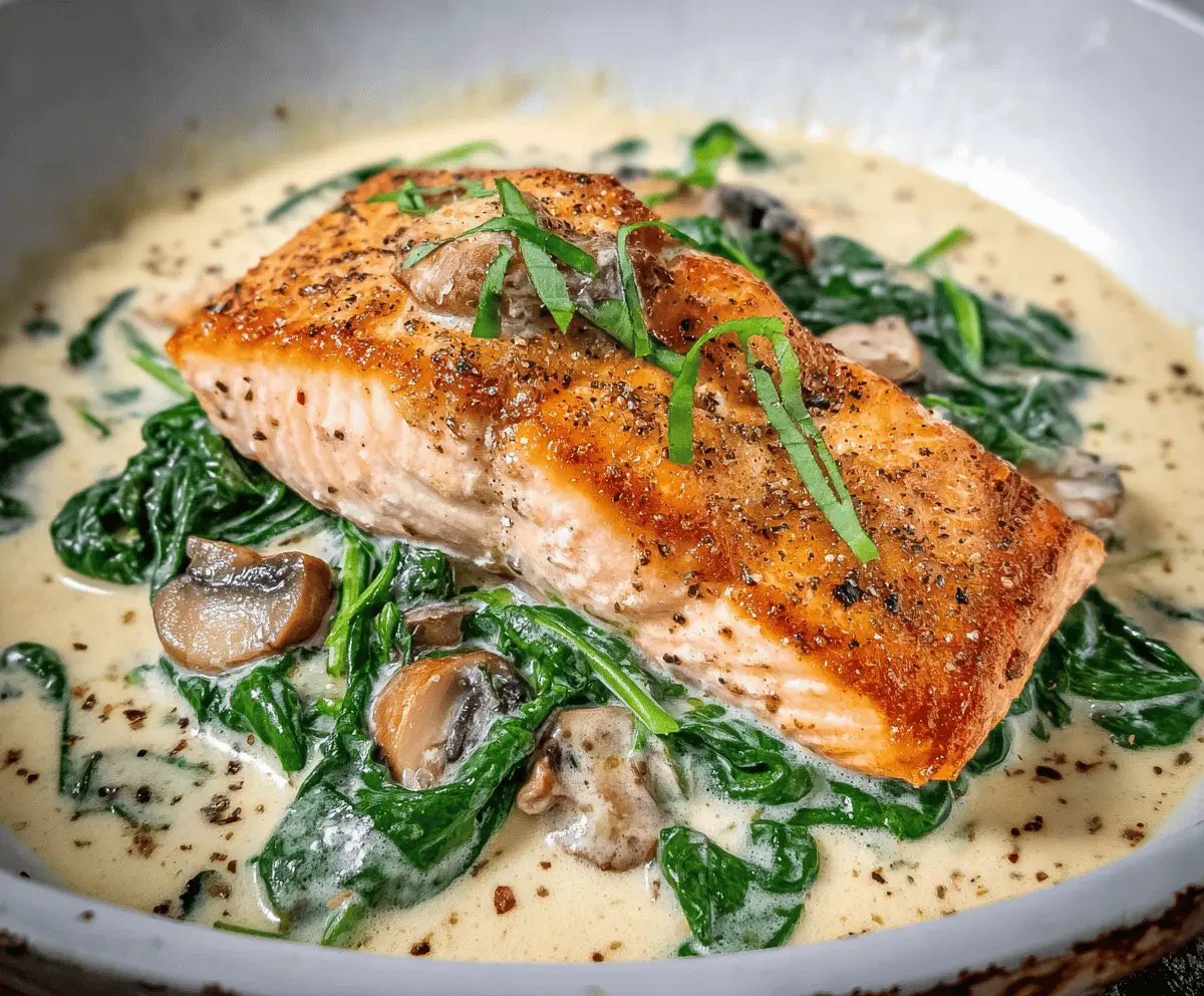 Return the salmon fillets to the skillet, nestling them into the creamy spinach and mushroom sauce. Spoon some sauce over the top of the salmon and let it warm through for an additional 1-2 minutes.