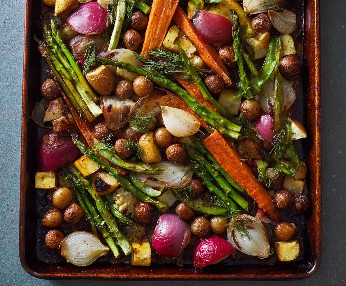 This colorful dish features fresh spring vegetables like asparagus, carrots, and bell peppers, all roasted together on a single pan. It’s simple, healthy, and full of flavor!
