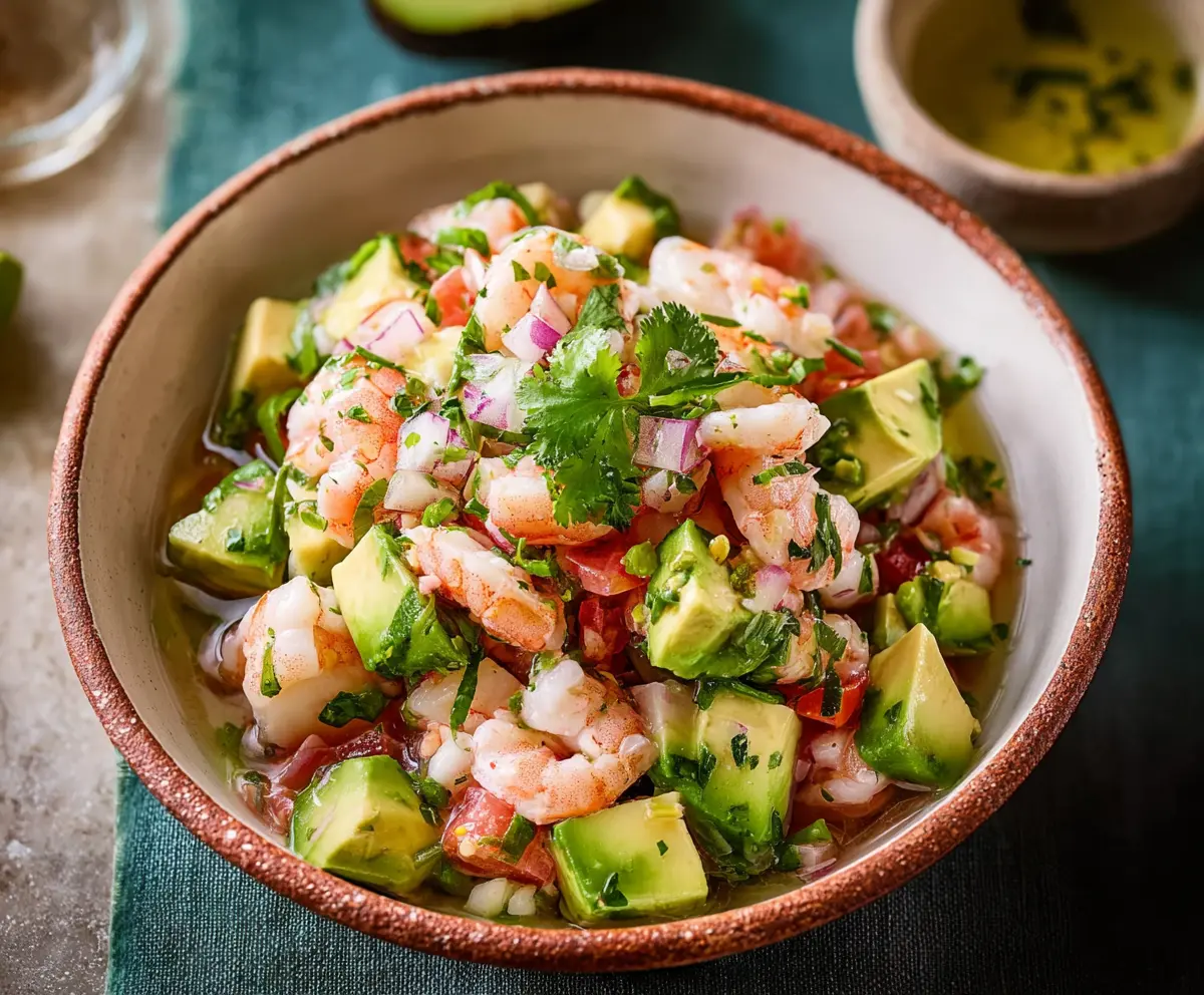This shrimp ceviche with avocado is flavorful, fresh, and perfect for warm days. Enjoy every bite! 🍤🥑