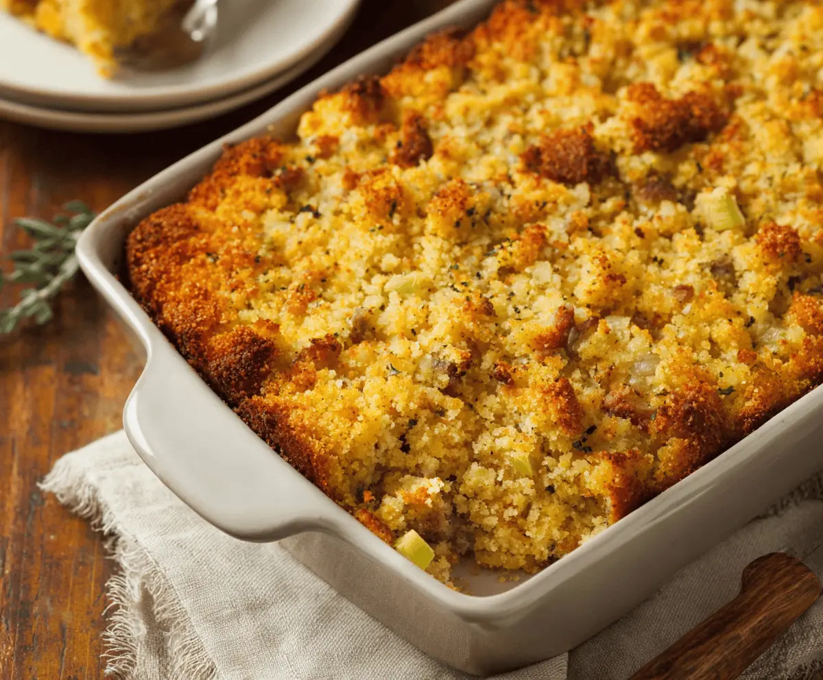 This Southern Cornbread Dressing is warm, comforting, and full of flavors! Made with homemade cornbread, onions, celery, and a blend of spices—it’s a perfect side for any meal.
