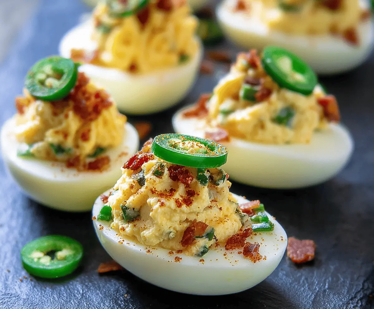 Top each deviled egg with a small piece of crispy bacon, a sprinkle of smoked paprika, and a few chopped chives or green onions for that pop of color. If you like it hot, slice up some extra jalapeños to serve alongside. Finally, chill the deviled eggs in the fridge for at least 30 minutes before serving to let those flavors mingle together.