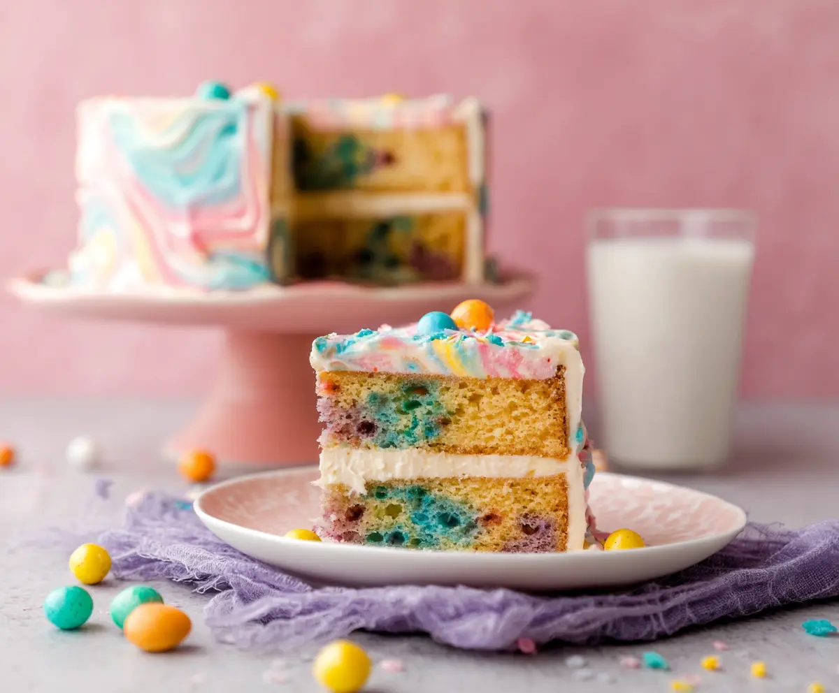 Refrigerate the cake for about 30 minutes to help the frosting set before slicing. Once ready, slice and serve this delightful swirled Easter cake to enjoy with family and friends. It’s a beautiful way to celebrate with a tasty, colorful dessert!