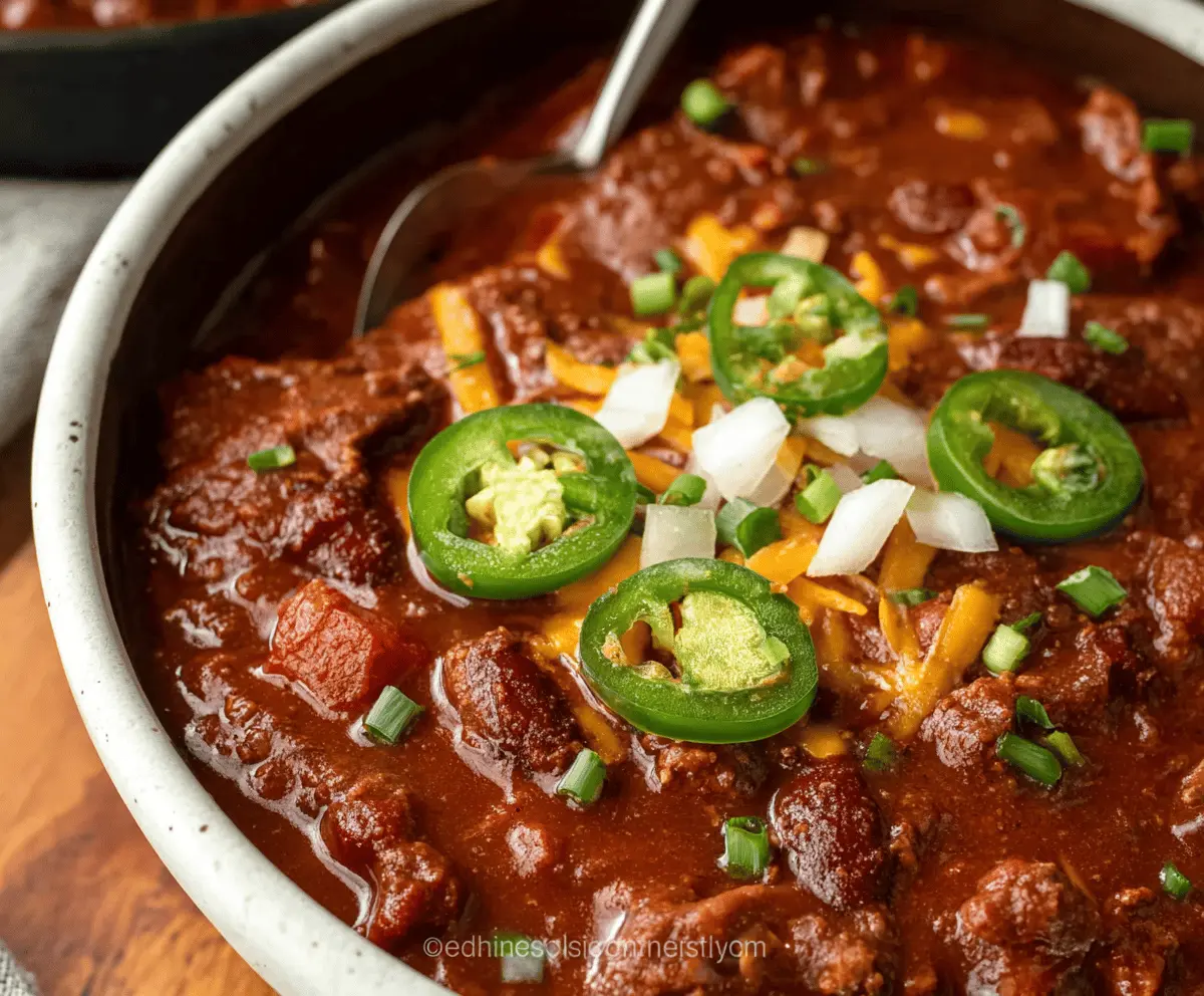 Dish your chili into bowls and top it with the garnishes of your choice, like shredded cheddar cheese, diced onions, jalapeño slices, and green onions. Enjoy it alongside some cornbread or tortilla chips for a cozy meal!