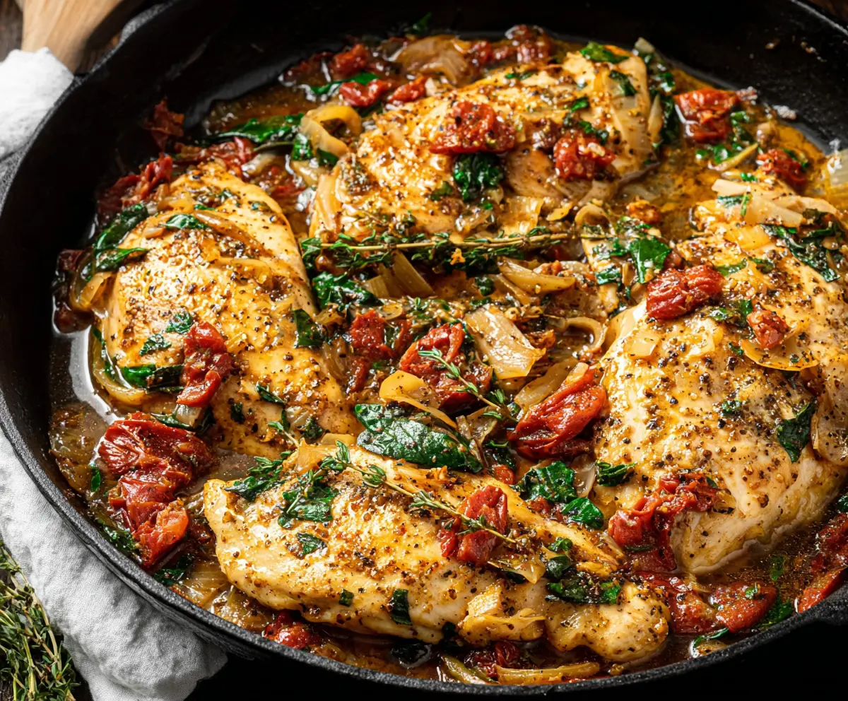 This Tuscan Chicken Skillet is a tasty one-pan meal that’s packed with flavor! Tender chicken, spinach, sun-dried tomatoes, and creamy sauce come together for a comforting dish.